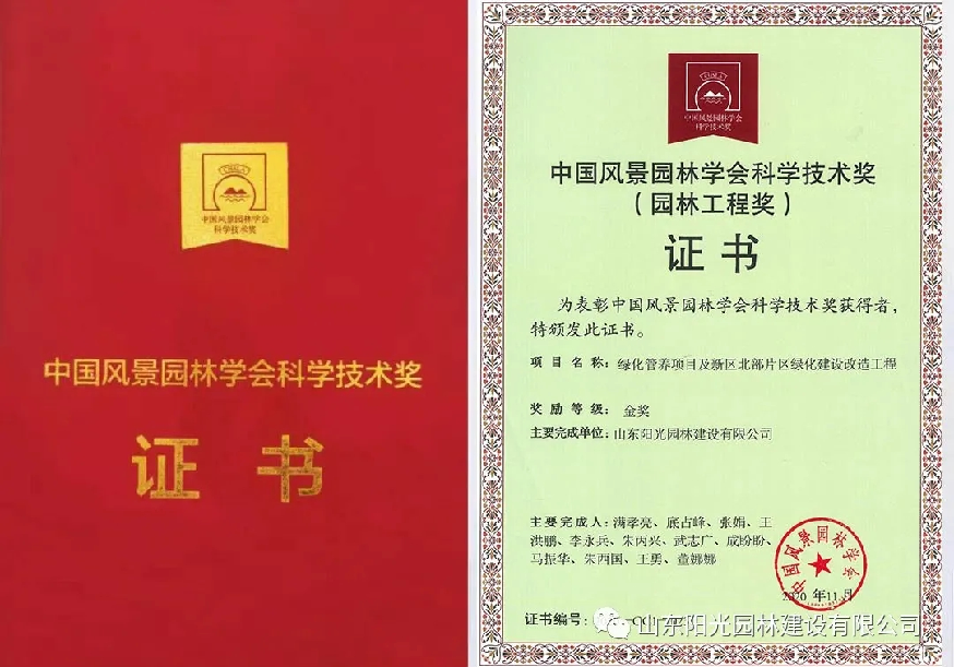 化(huà)管養項目及新區(qū)北(běiα)部片區(qū)綠(lǜ)化(huà)建設改造工(gōng)程榮獲2020 年(ni₩↔↕án)度中國(guó)風(fēng)景園林(lín)學會(h'©uì)科(kē)學技(jì)術(shù)獎(園林(lín)工(gōng)程)最☆₽φ'高(gāo)獎項——金(jīn)獎。