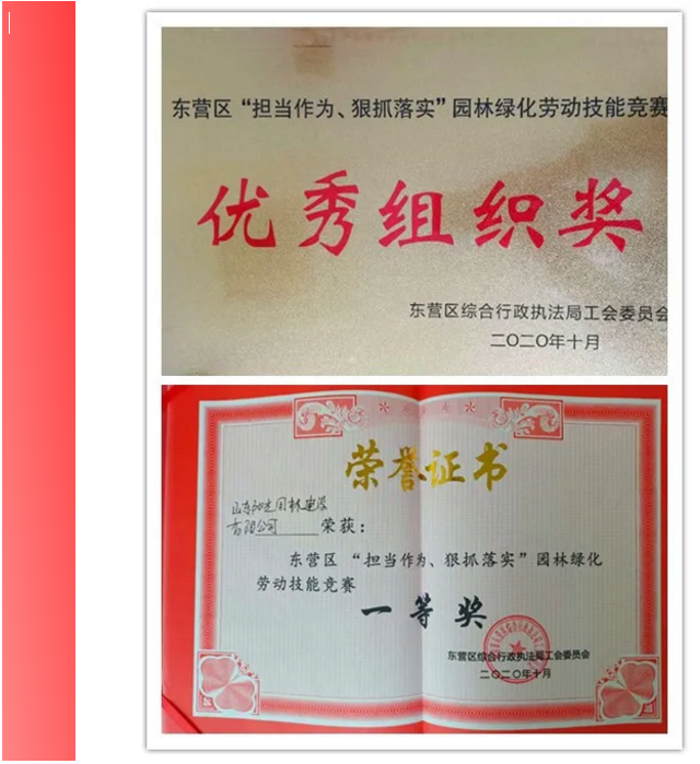 2020年(nián)10月(≠λ₽ yuè)26日(rì)至10月(yuè)28" 日(rì),東(dōng)營區(qū)組織了(le)™★“擔當作(zuò)為(wèi)、狠抓落實”園林(l&♣✔ ín)綠(lǜ)化(huà)勞動技(jì)能(néng)競賽,公司員(yuán® )工(gōng)憑借著(zhe)紮實的(de)理(lǐ)論基礎和(hé)娴熟σ"→∏的(de)操作(zuò)技(jì)能(néng)榮獲一(y>>σφī)等獎和(hé)優秀組織獎!